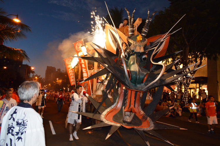 Furthermore, the Consulate General of Japan, Shigeeda and the governor of Hawaii, David Ige rode on the Daijyayama from the front of the Moana Surfrider Hotel. The performance reached its climax with many cheers and a big round of applause. Everybody seemed highly anticipated for the parade next year as well. The performers felt a sense of accomplishment while the audience seemed gratified by the performances which were inspiring.