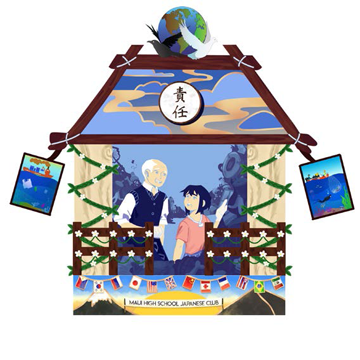As we face pollution, one of the most known problems around the world, we wanted to express that regardless of age and gender, with everyone working together, even the small steps can solve one of the most significant issues. Similarly, the intertwined ti leaf lei symbolize the intertwining of our Hawaiian culture and the uniting of everyone in peace and strength. Held together by the dove and crow from the topper, the rope holding the 12 country flags represents the bond between the nations of the world, from the highest peak of Mauna Kea of Hawaii to Mount Fuji of Japan. The sunrise connecting them all represents the start of a new day, full of endless possibilities.