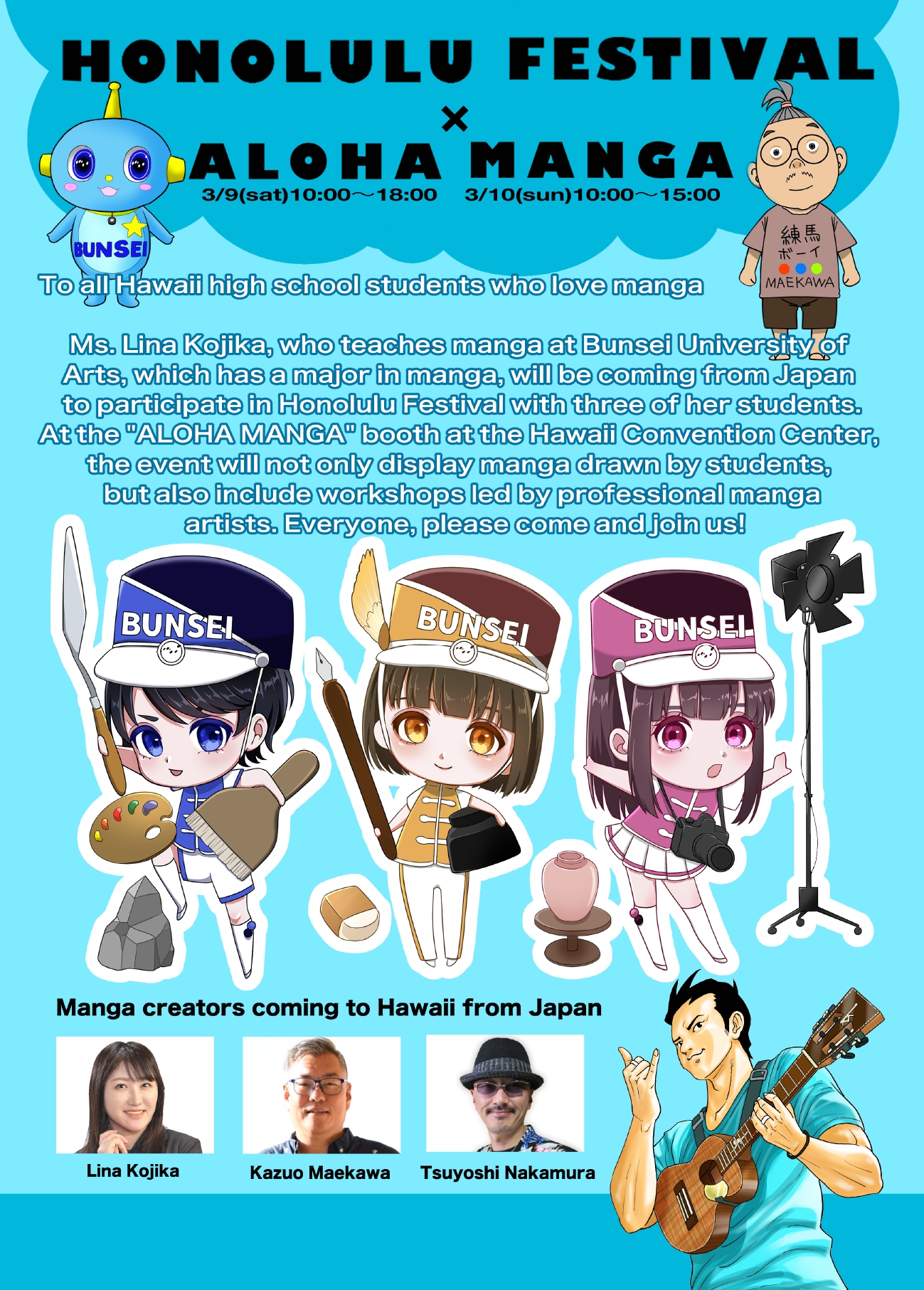 At the “ALOHA MANGA” booth at the Hawaii Convention Center, the booth will display not only manga drawn by students, but also include workshops led by professional manga artists. Ms. Lina Kojika, who teaches manga at Bunsei University of Arts, which has a major in manga, will be coming from Japan to participate in Honolulu Festival with three of her students.