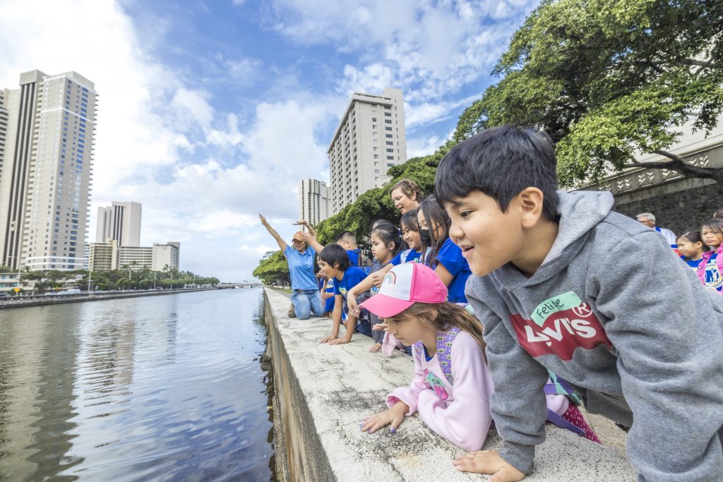 朝9時からの教育プログラムでは、地元の小中学校から招待された学生280名を迎えて、投入イベントのはじまりです!まずはコンベンションセンターに設置されたゲンキ・アラワイ・プロジェクトのブースを訪れ、ゲンキボールについての説明を受講、しっかり学んだあとに、アラワイ運河へ移動して、次々とゲンキボールが投入されていきました。