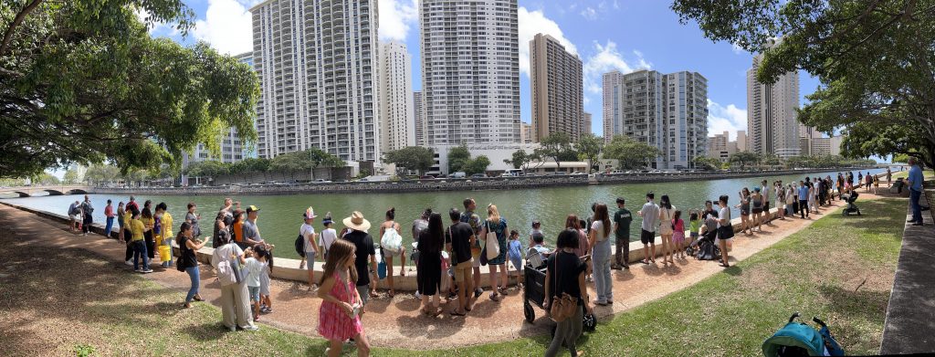 実はこの日の2日前に、投入イベントが行われる、まさにこの場所で、絶滅危惧種に指定されているハワイアンモンクシール(アザラシ)が泳いでいる姿が目撃されて地元ニュースで大々的に報道された事もありゲンキ・アラワイ・プロジェクトの活動が一気に注目されました。それも手伝ってセレモニーには地元の新聞やニュース局各社が取材にかけつけました。