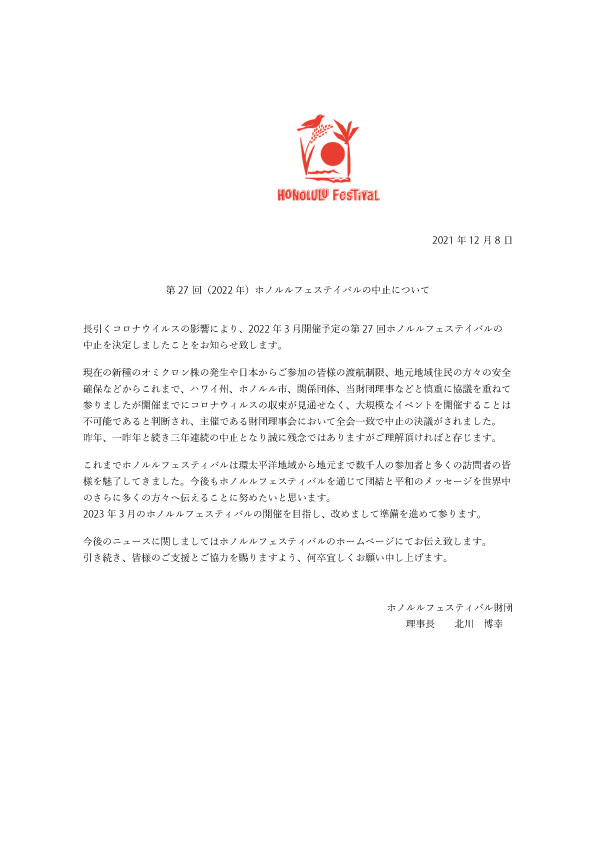 《重要なお知らせ》第27回(2022年)ホノルル フェスティバルは開催中止となりました