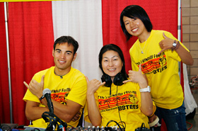The small reporting team was organized which the reporters and interviewers go around the venue to find and report the amusement and attractiveness of the Honolulu Festival.